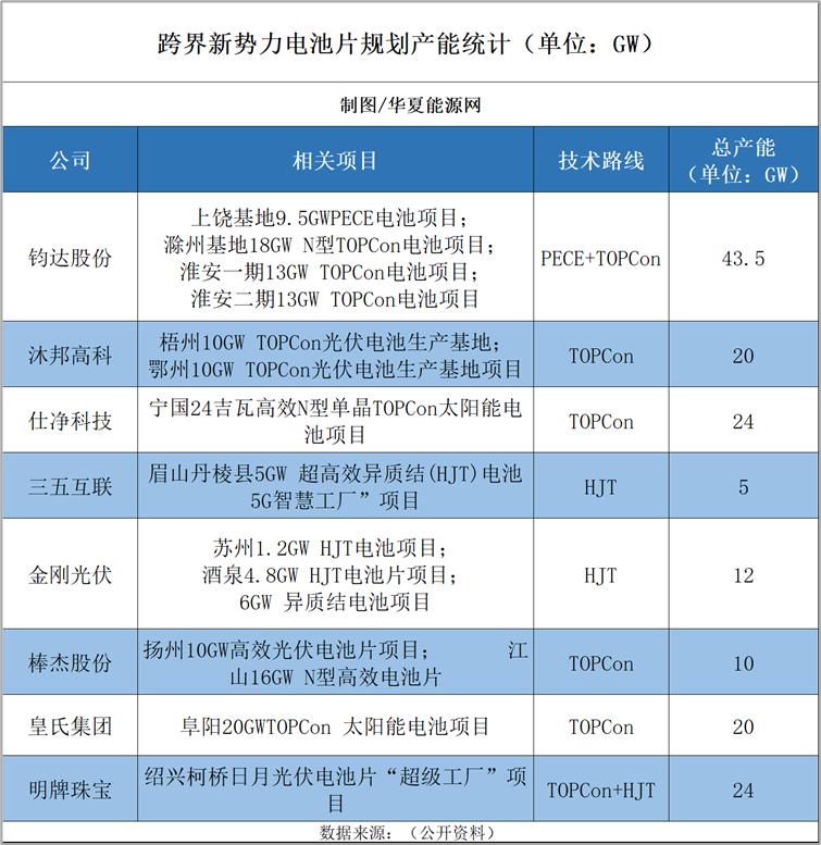 华夏能源网(公众号hxny3060)统计发现,仅7月底到8月中旬的20天内,就有协鑫集成(SZ:002506)芜湖10GW高效TOPcon电池片项目(7月28日)、天合光能(SH:688599)青海5GW 210+N型i-TOPCon高效电池项目(8月1日)、华东重机(SZ:002685)徐州沛县10GW电池片项目(8月8日)、新霖飞集团10GW高效N型TOPCon电池项目(8月16日)等相继投产。