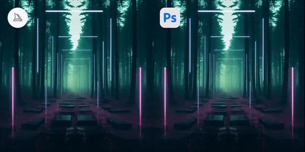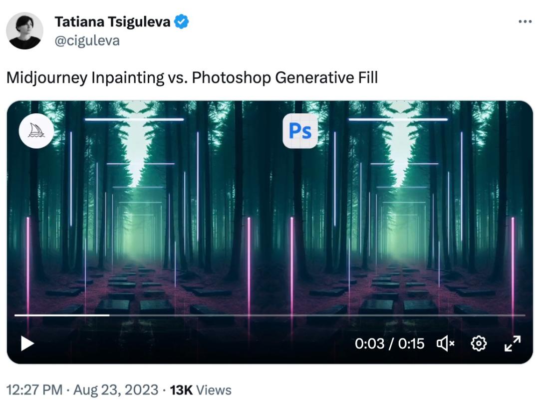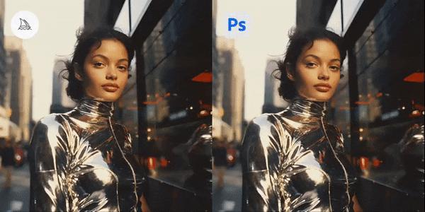 不得不说,Midjourney 这个新功能在一定程度上可以替代图片的 Photoshop 处理工作(PS),并且更加简捷方便,只需要用户文本描述出图片编辑需求。有人迅速对比了 Midjourney 和 Photoshop 的处理效果。