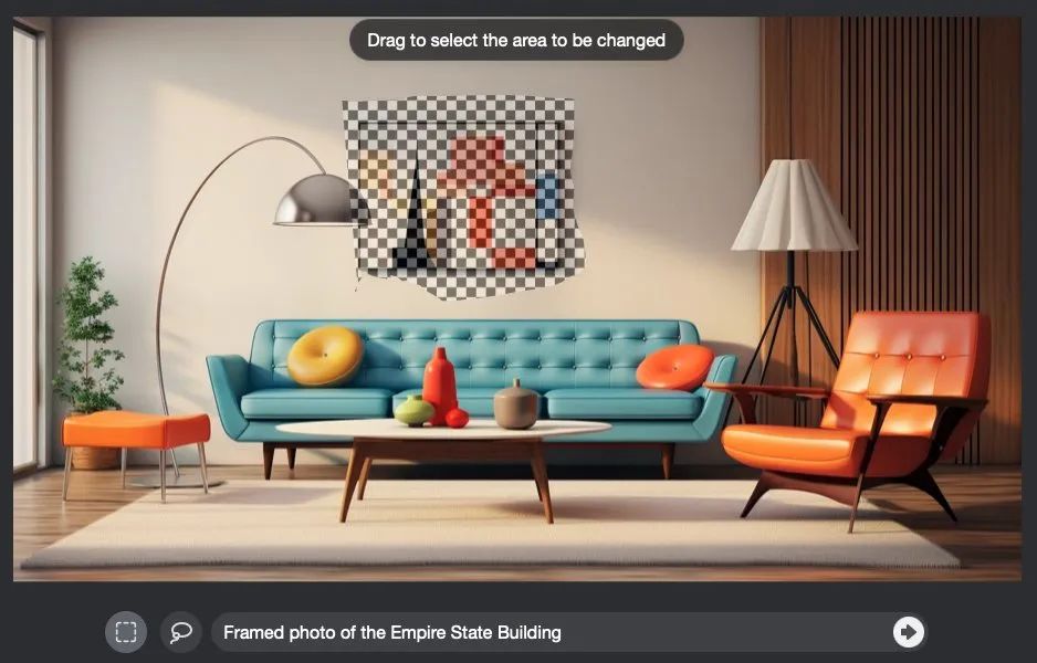 在 Vary (Region) 的编辑页面,他首先选中挂画区域,然后输入文本 prompt:「Framed photo for the Empire State Building(帝国大厦的镶框照片)」: