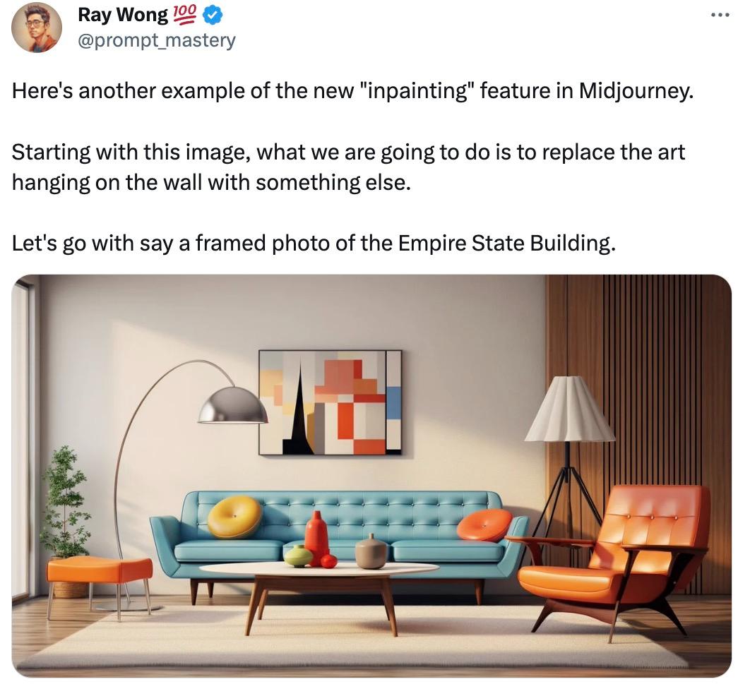 一位名为 Ray Wong 的网友尝试将图像中墙上的挂画替换成「帝国大厦」的风景照。