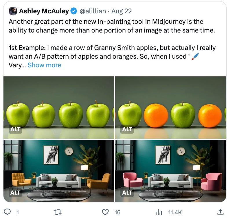 此外,Midjourney 这个全新的功能还能够同时修改图像的多个部分。例如有网友将一排苹果中的几个改成了橙子,注意选择苹果下方的反射区域,会让新生成的橙子在桌面上也有反射倒影。
