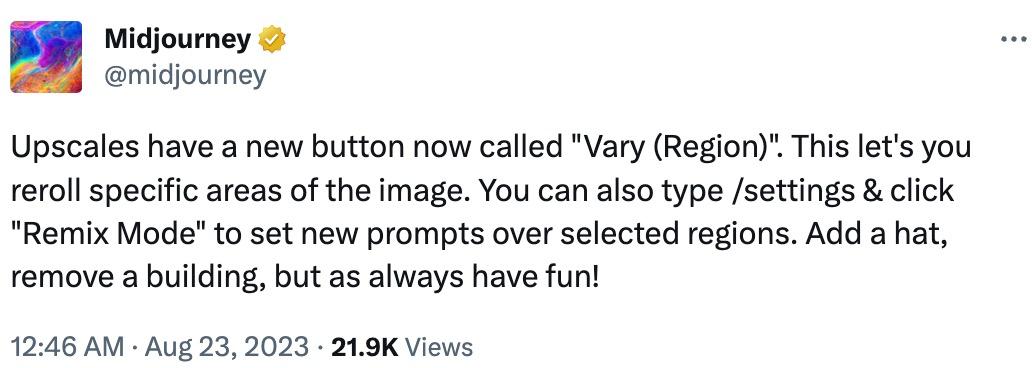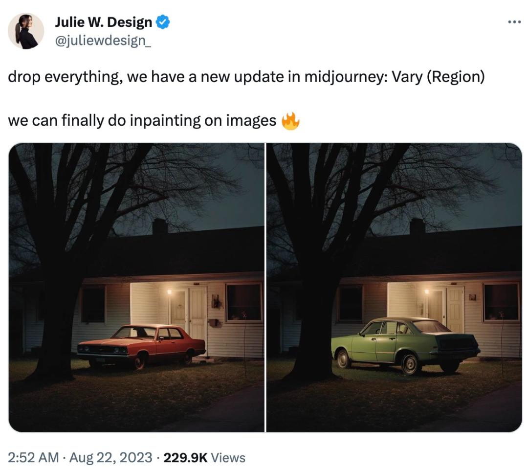 现在,Midjourney 又宣布推出一个全新的功能 Inpainting—— 修改图像的部分区域。具体来说,Midjourney 上现在有一个新的按钮「Vary (Region)」,使用该功能,用户可以选中想改变的区域,输入新的文本 prompt,直接用文本修改图像。