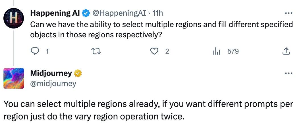 在上面的例子中,同时选中的多个区域都变成了相同的橙子。有网友提问:「是否可以同时选中多个区域,并在这些区域分别填充不同的指定对象?」对此,Midjourney 给出的回答是「您可以执行该变换操作两次」。看来,Midjourney 暂时还不能同时给多个区域填充不同对象。
