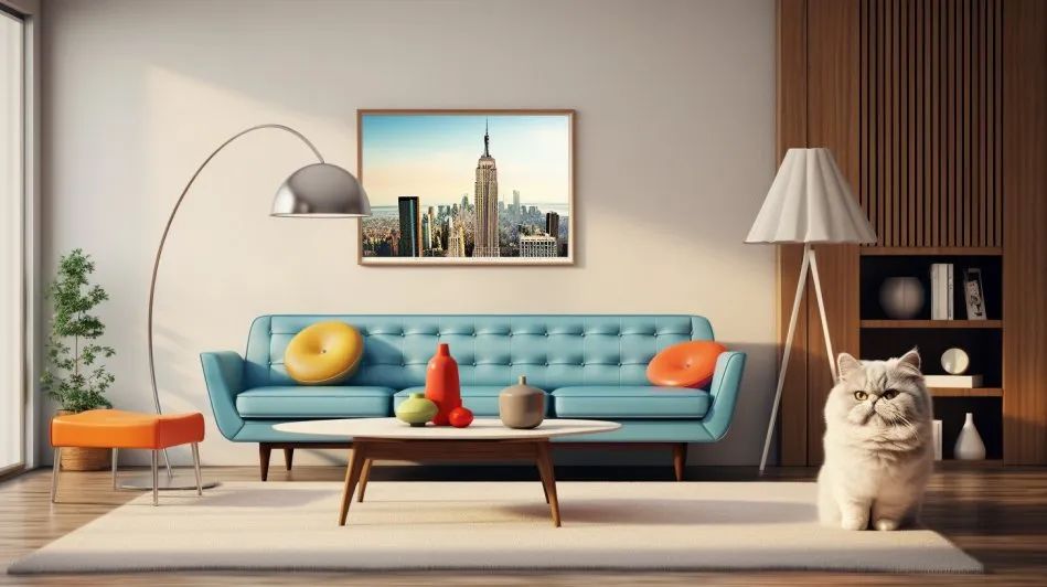 Midjourney 生成的结果如下图所示。值得注意的是,Ray Wong 在选中图像区域时,覆盖到左边的落地灯,在生成结果中,Midjourney 准确地将「帝国大厦镶框照片」放在落地灯后面的墙壁上作为背景,落地灯保持完整可见。