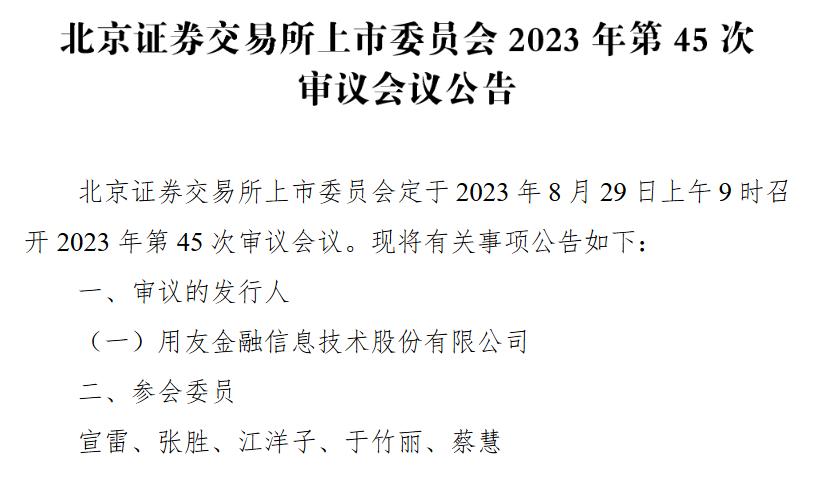 挖贝网 8月23日消息,北交所上市委定于8月29日召开2023年第45次审议会议,用友金融(839483)上会,参会委员为宣雷、张胜、江洋子、于竹丽、蔡慧。