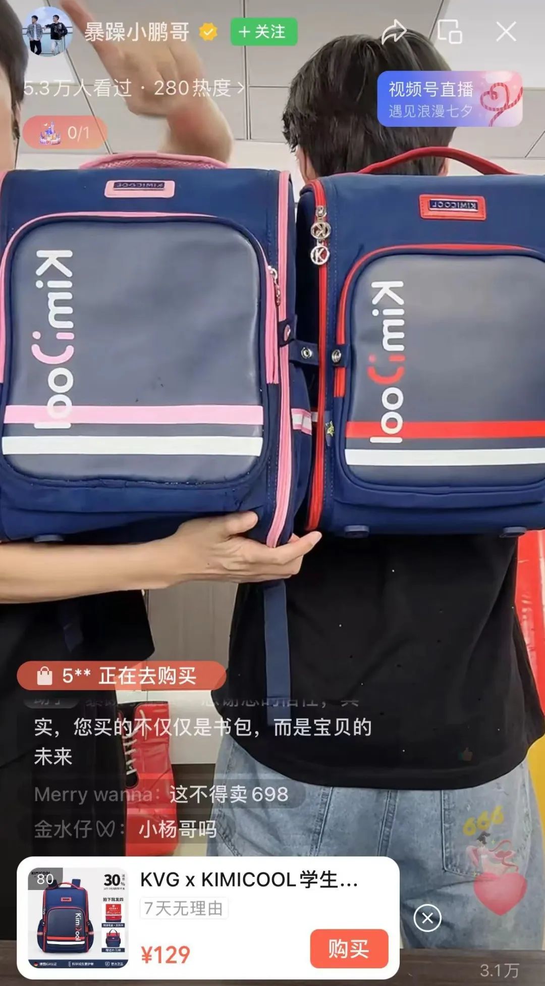 值得关注的是,@暴躁小鹏哥 账号的最大特点,就是其直播间高度还原了@疯狂小杨哥 的设计,不论是背景布置、货盘选择,还是两位主播的人设打造、卖货手段,都有着浓浓的“小杨哥味道”。
