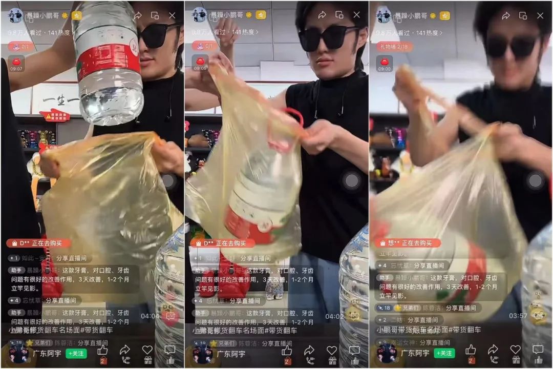 随着小鹏哥松手,一大桶农夫山泉直接掉进了下方的黄色垃圾袋中。遗憾的是,与其想要展示的“稳稳兜住”不同,垃圾袋从提手处迅速裂开,直接在直播间上演了一次“翻车现场”。