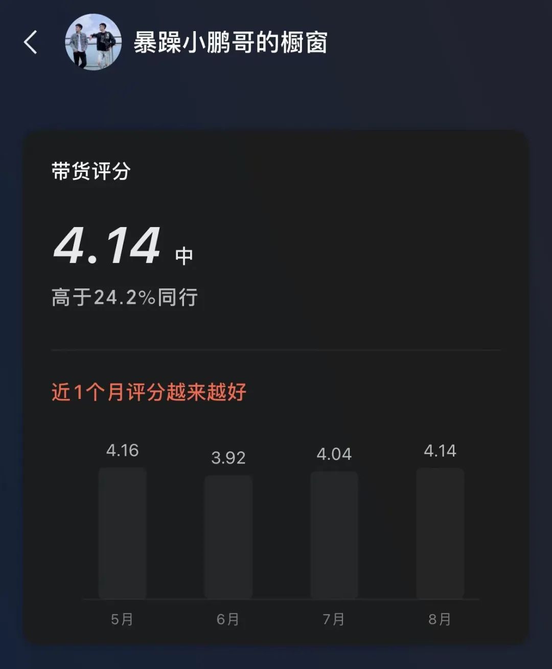 而在直播端,视频号官方数据显示,@暴躁小鹏哥 橱窗的带货评分只有4.14,评级为中,只高于平台内24.2%的同行。