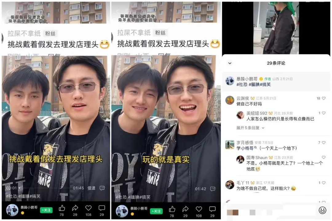 对比之下,@暴躁小鹏哥 虽然借着模仿小杨哥在视频号上收获了一些人气,但这种流于表面的“1:1”式模仿玩法究竟能带他们走多远?我们一起来看。