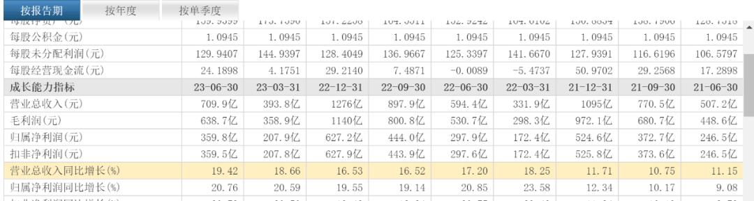王莉将带领茅台走向何方,还是要回到其财报中来寻找端倪。近日,贵州茅台(600519,以下简称茅台)发布2023年上半年财报,中报显示,今年上半年茅台总营收709.9亿元,同比增长19.42%;归母净利润 359.8 亿元,同比增长20.76%,其中Q2茅台总营收316.1亿元,同比增长20.4%;归母净利润151.9亿元,同比增长21.0%,高于市场预期。上半年每日净赚约2亿元。
