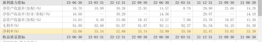 事实上,相较于2022年同期,2023年上半年茅台的营业利润率稍有下滑。2022年同期茅台毛利率为92.11%,净利率为53.99%,今年上半年的毛利率为91.80%,同比下滑0.31个百分点,净利率为53.66%,同样下滑了0.33个百分点,尽管毛利率和净利率下滑幅度都不大,但对于茅台这样体量的企业来说,毛利率和净利率每下滑0.1个百分点,都是不小的金额。