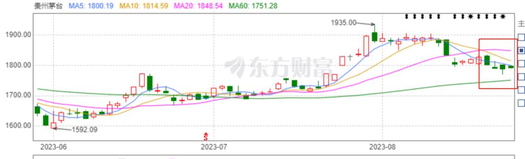 但如此出色的业绩,并未带来资本市场的强力支持,相反在中报披露后,茅台的股价还在当日出现微跌,次日收盘股价为1890元,仅上扬0.11%。8月18日开始,一波四连跌,跌破1800元大关,和2021年2月2539.09元的最高点相比,市值跌幅超四分之一。