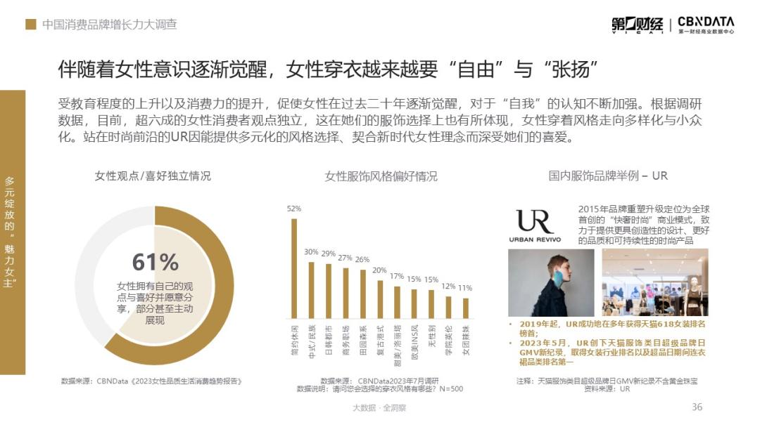 以快奢时尚品牌URBAN REVIVO(简称UR)为例,在洞察到女性消费者的新需求后,UR分析了国际快时尚品牌的弊病,从“原创性”、“品质”与“可持续”三方面入手,以更加先锋的设计、更高的品质与更适宜的上新速度,对品牌商业模式进行了全方位的升级,开创了“快奢时尚”赛道。经历了十余年的品牌沉淀后,2019年起,UR多次摘得天猫618女装排名桂冠,并在2023年5月创下天猫服饰类目超级品牌日GMV新纪录。