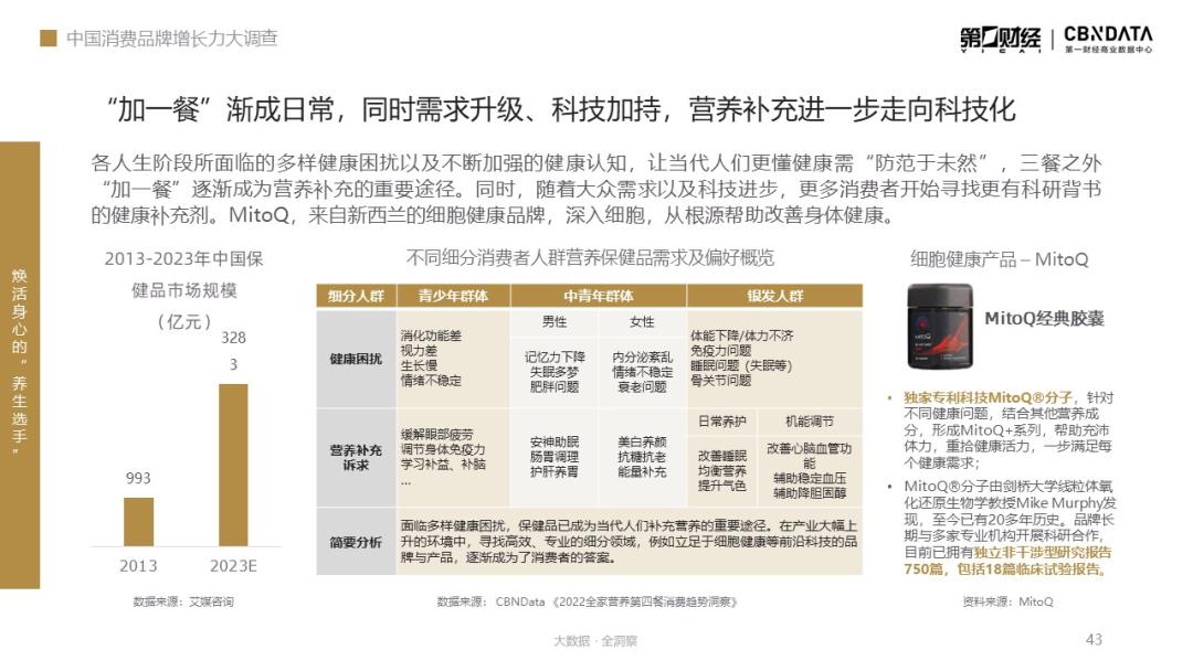 从青年到中年再到银发群体,不同年龄段面临的健康困扰和营养补充诉求各有不同。“防范于未然”,在三餐之外“加一餐”逐渐成为营养补充的重要途径。而由于保健品选购知识仍存在一定的学习门槛,且市场上保健品品质鱼龙混杂,为了减轻消费决策过程中的困难,更多消费者开始寻找更有科研背书的健康补充剂。