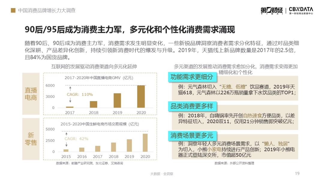 2017-2019年,5G引领万物互联,数字化变革持续深化,中国消费市场也随之进入了多元消费阶段。伴随着消费人群的迭代,90后/95后成为消费主力军,Ta们多元化与个性化的需求,也带动了一批新锐品牌通过品类细分与差异化竞争进一步升级迭代。