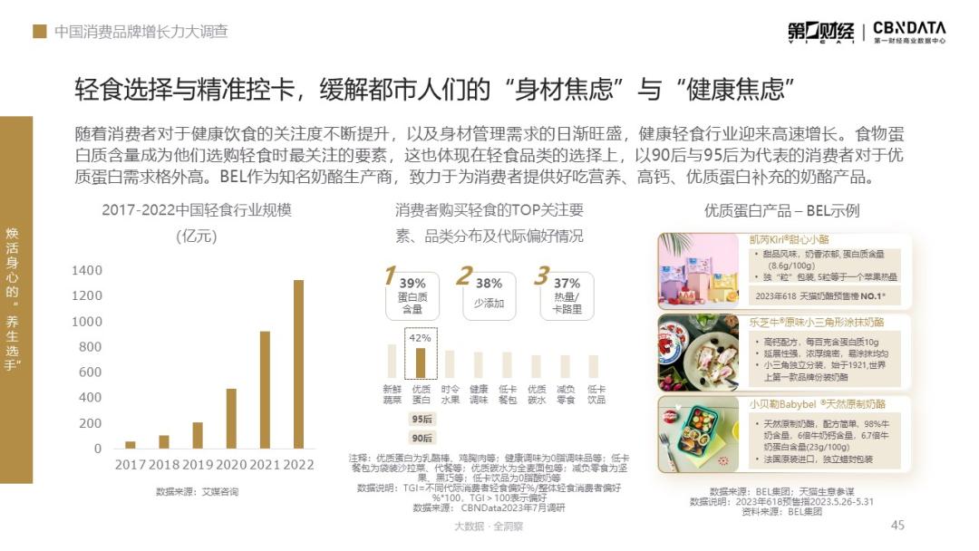 在健康轻食与食物蛋白产品选择的过程中,“美味”与“低卡”往往难两全。作为知名的奶酪生 产商,Bel洞察到了这一消费诉求,通过凯芮Kiri®甜心小酪、乐芝牛TheLaughingCow®原味小三角形涂抹奶酪及小贝勒Babybel®天然原制奶酪等多款份装奶酪产品,不断满足消费者在各类场景下的美味及健康需求,提供更符合“中国胃”的好吃营养、高钙、能量可控、优质蛋白补充的奶酪产品。正因如此,其明星产品Kiri®甜心小酪才能登顶2023年618天猫奶酪预售榜NO.1。