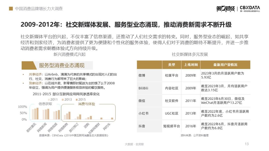 2008年奥运会成功举办后,以2009年3G技术引入为起点,2009-2012年我们迎来了社交媒体平台的繁荣。在消费与内需的重要性不断被政策强调的同时,服务型消费业态向互联网迁移的速度加快,网络购物、旅行预订等互联网应用的网民渗透率逐年提升。与此同时,微博、哔哩哔哩、微信等一众社交新媒体平台也在此阶段登上了商业舞台。
