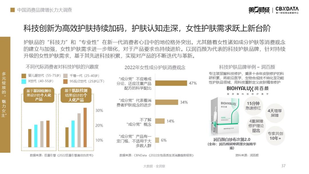 在护肤领域,随着女性消费者护肤观念的升级,对护肤品的选择维度也更加多元,迎来了从最初的“品牌论”到“成分党”再到“注重配方科学性”的转变。据CBNData调查显示,有47%的女性认为,“成分党”不应唯成分论,还应注重产品配方的科学配比。“科技力”和“专业性”逐渐被摆在了护肤品消费决策更为关键的位置。
