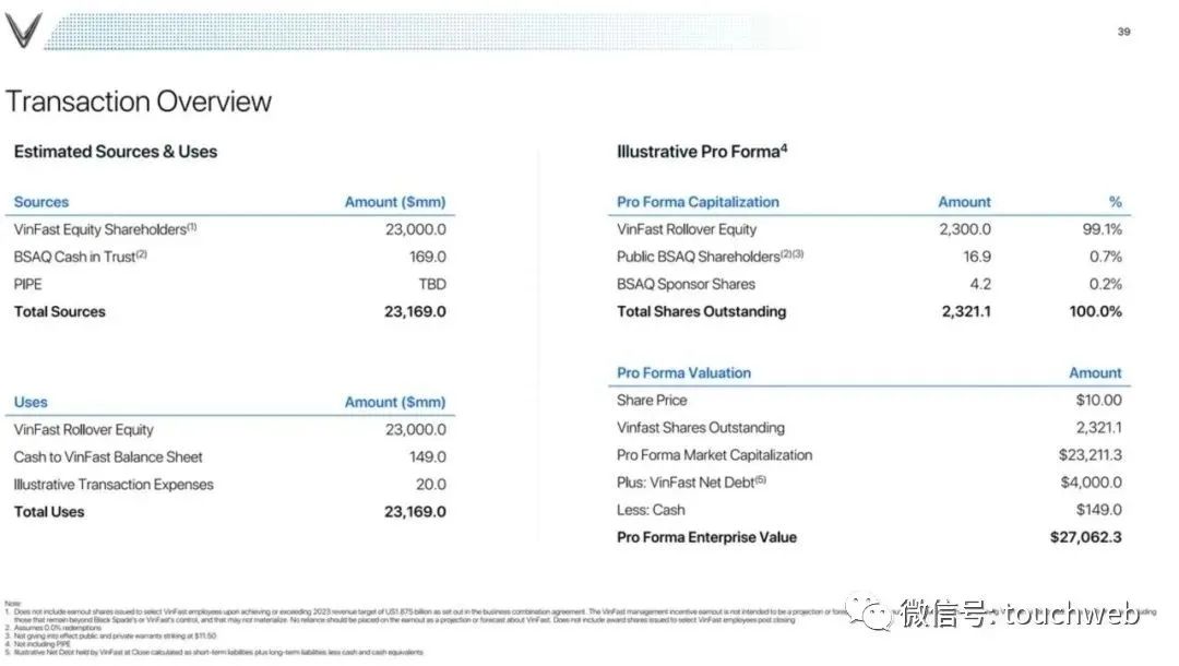 企业合并对VinFast的估值约为270亿美元,股权价值约为230亿美元,不包括来自BSAQ的约1.69亿美元信托现金(假设没有Black Spade股东选择赎回其Black Spade股份 在允许的情况下使用现金)。