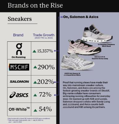 《Big Facts》报告中显示,今年前7个月,On昂跑交易量增长15357%;萨洛蒙交易量增长202%;Asics的交易量则增长72%。随着跑步者品牌重塑,On昂跑、萨洛蒙和亚瑟士人气飙升,这证明跑鞋已进入主流运动鞋文化。