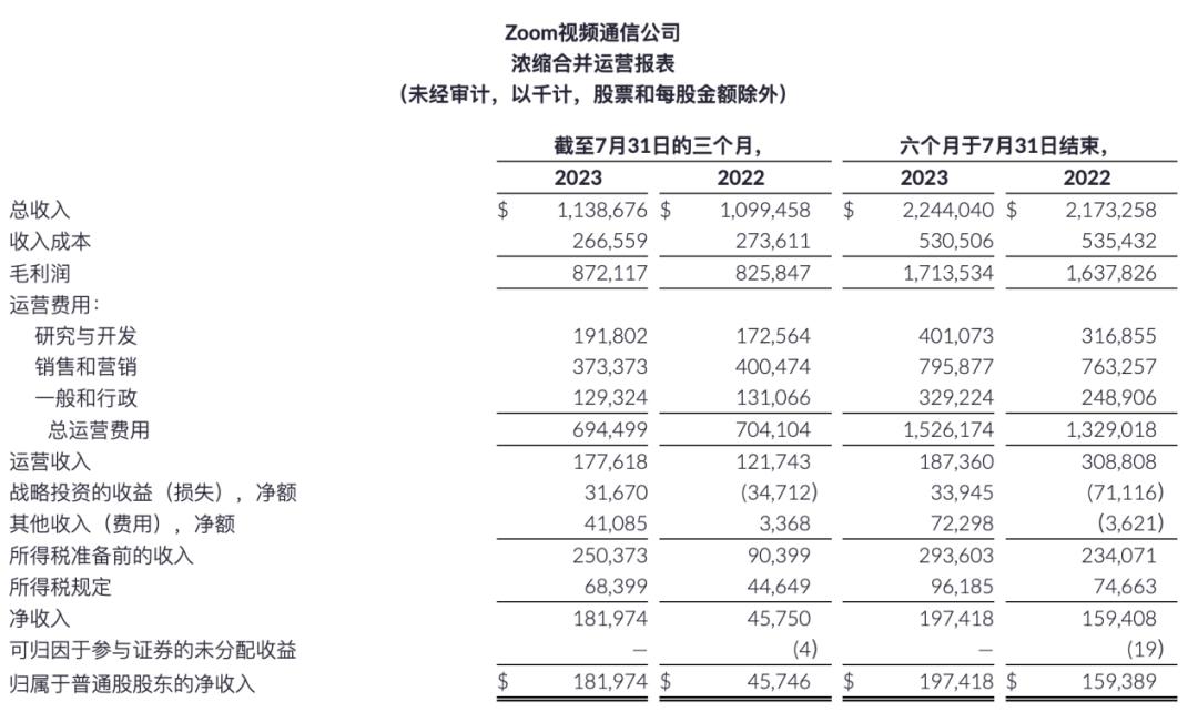 财报显示,第二季度Zoom总收入为11.39亿美元,同比增长3.6%;企业归母净利润为1.82亿美元,同比增长297.79%,均超出分析师预期。究其缘由,主要是收入成本、运营费用下降,运营收入提升。