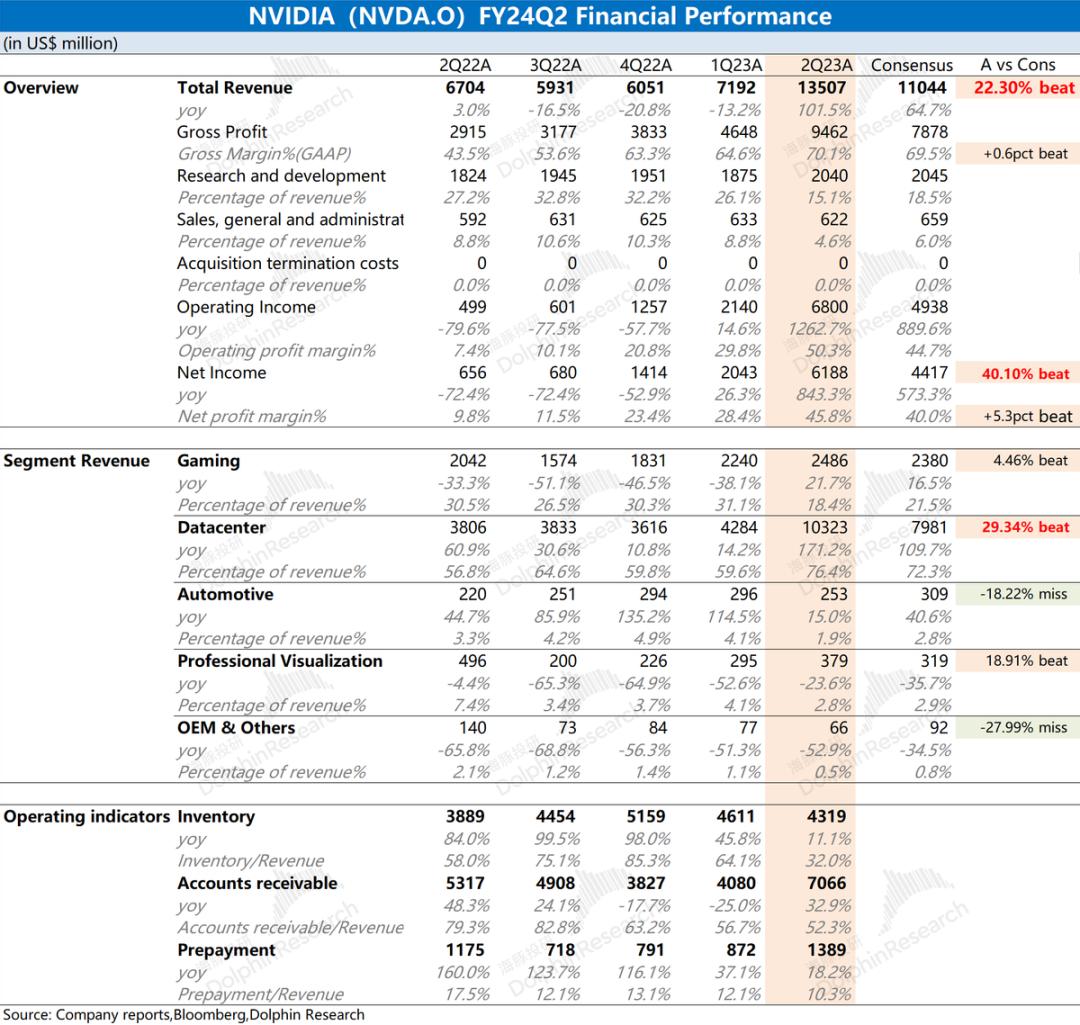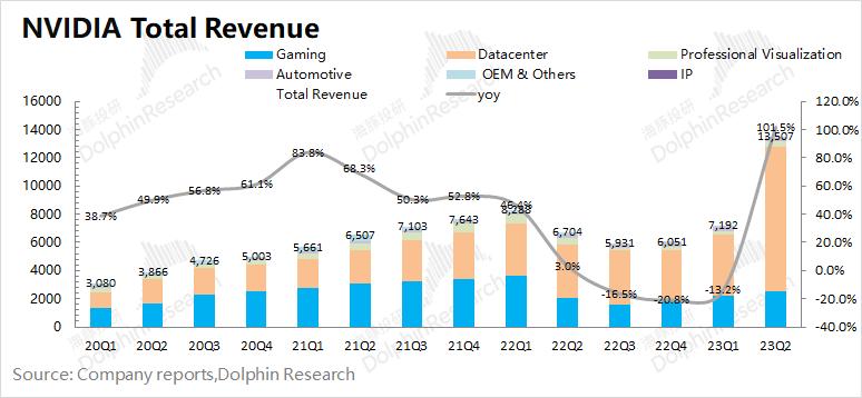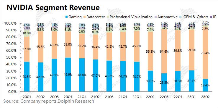 对于三季度如此超预期的指引,海豚君认为PC和游戏业务开始迎来回暖,而其中主要超预期仍是来自于AI和大语言模型方面激增的需求。在美国大多数科技股二季度交出相对疲软数据的情况下,英伟达呈现出“一家独赢”的局面。这展现出市场对数据中心业务依然有着强烈的需求,而英伟达在市场中具有绝对领先优势。