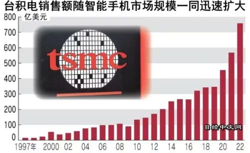 比如,从iPhone上市的2007年到2022年15年间,苹果销售额增至16.4倍,台积电也增至7.7倍。在AI用芯片上一家独大的英伟达也增长迅速。如果没有台积电,其有可能一直在初创企业阶段停滞不前,无法取得如今的地位。