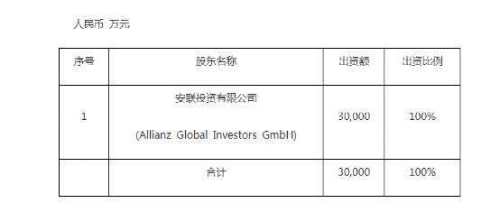 安联基金注册资本为3亿元人民币,安联投资有限公司出资比例为100%。