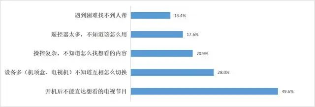 类似情况非常普遍,根据中国家电网公布的《2022中国适老化电视调研报告》显示,在平时使用智能电视的过程中遇到的困难问题上,“开机后不能直达想看的电视节目”、“设备多(机顶盒、电视机),不知道互相怎么切换”、“操作复杂,不知道怎么找想看的内容”、“遥控器太多,不知道该怎么用”、“遇到问题找不到人帮”是最多被用户吐槽的使用痛点。