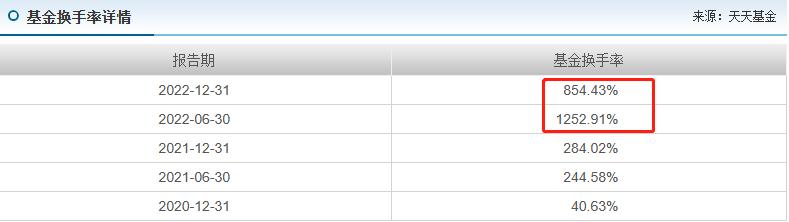 陈洁馨接手之前,该基金的换手率还不到300%,而陈洁馨接管之后换手率最高飙涨到了1252.91%,低的时候也高达854.43%。