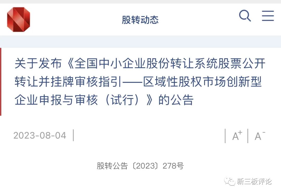 8月4日,为便利区域性股权市场(俗称四板)创新型企业申请在全国中小企业股份转让系统(俗称新三板)挂牌,全国股转让公司制定并发布实施《全国中小企业股份转让系统股票公开转让并挂牌审核指引——区域性股权市场创新型企业申报与审核(试行)》。