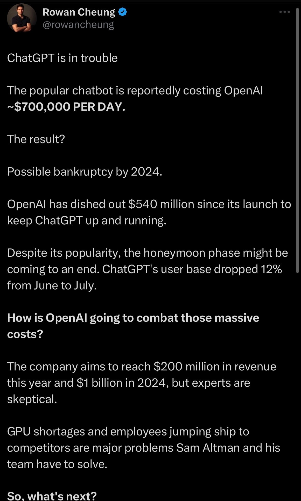 到目前为止,生成式人工智能还没有做到这一点。也许是几个亿,也许不是几十亿。当然不是几千亿。过去几天互联网上流传的谣言甚至暗示, OpenAI 甚至有可能面临破产,快的话可能是在 2024 年,Rowan Cheung 的一条推文几乎是一发布就被删除了。