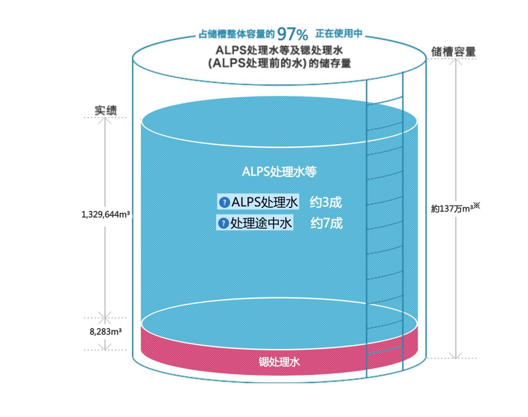 根据东京电力公司官网的数据,其现场的储水能力共约137万立方米。截至2023年5月18日,福岛核电站厂址内已经建了1073座储水槽,其中包括ALPS处理水储槽1033座,锶处理水储槽27座,海水淡化处理水27座,浓缩盐水1座。截至6月29日的最新数据是,储水总量已经达到133.8万立方米,已经达到总储水能力的97%。