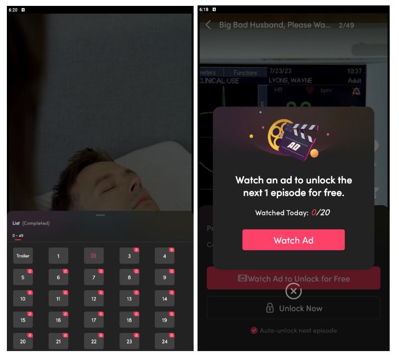 体感上,Reelshort 的付费点卡得还是挺紧的。虽然在 TikTok 上放出了前 20 集的内容,但是当用户来到 App,平台上仅有第一集是免费观看的,并且,即使用户在其它平台上看过前面的剧集也需要从头开始解锁。而解锁需要购买硬币或者观看广告(广告解锁剧集的上限是单日 20 集),虽然理论上说用户只要愿意等待+看广告是可以免费观看短剧的, 但对于被剧情吸引而一路跳转到 App 内的用户而言,往往可能已经没有耐心,大多会一时“上头”而下单。