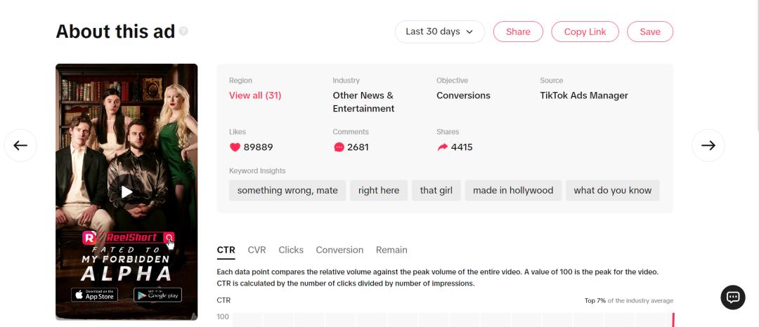 虽然 Reelshort 在 TikTok 上投放的素材总量不算多,但是投放力度应该不小。单支广告点赞数接近 9 万,评论、分享数千次| 图源:TikTok creative center