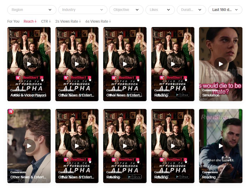 与此同时,一个比较值得注意的情况是,虽然第三方平台几乎没有抓到 TikTok 上的投放素材,但是透过 TikTok 的广告库其实是能看到 Reelshort 做了一些投放的,其中多数素材被放到了 Reading 的类目底下,也有一部分归为 Other News & Entertainment、Audio & Video Players 等等。