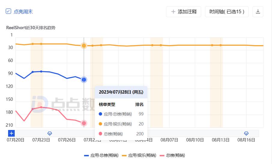 至 7 月底,Reelshort 在美国畅销榜中的排名已有所滑落 | 图源:点点数据
