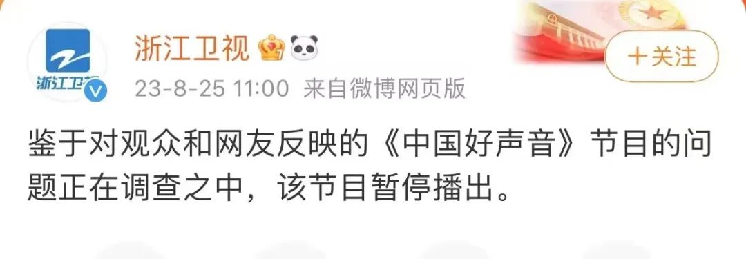 8月25日11时,浙江卫视官方微博称,“鉴于对观众和网友反映的《中国好声音》节目的问题正在调查之中,该节目暂停播出。”