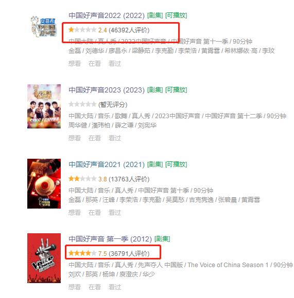 《每日经济新闻》记者注意到,近年来《好声音》收视和口碑均在下滑,致使它作为星空华文王牌IP的吸金能力加速变弱。据豆瓣,《好声音 第一季》7.5分,到了《好声音 2022》仅有2.4分。其招股书曾透露,2019年该节目毛利率为46.6%,2021年仅剩2.2%。