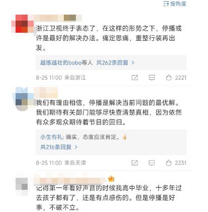 对于《好声音》的停播,网友纷纷评论称,“停播或许是最好 的解决办法”。不少网友希望,中国好声音节目组可以“重整行装再出发”“能在好声音里听到真正的好声音”。
