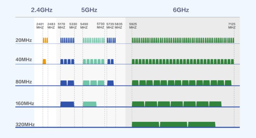 5GHz 频段最高有 13 个连续非重叠 20MHz 信道,在 Wi-Fi 5 和 Wi-Fi 6 标准下,最高支持 160MHz 信道。