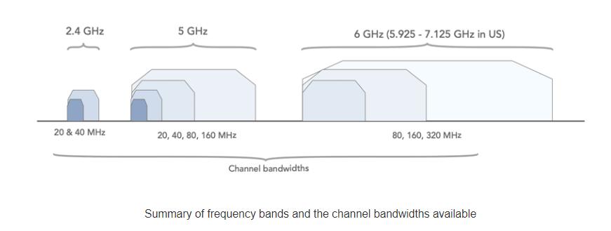 Wi-Fi 7 将支持更多的频段,包括 2.4GHz、5GHz、6GHz,在此之前,Wi-Fi 6 支持 2.4GHz 和 5GHz 两个频段,Wi-Fi 6E 只支持 6GHz 频段(Wi-Fi 设备向下兼容)。