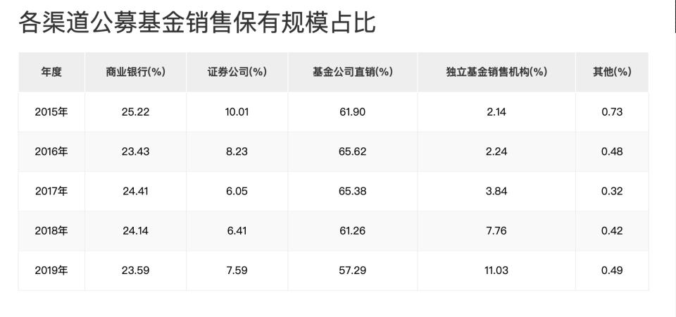 中国基金业协会的数据显示,2015年~2017年,商业银行的公募基金销售保有规模基本维持在24%左右;独立基金销售机构的保有规模则从2.14%缓慢上升至3.84%,到2019年升至11.03%。