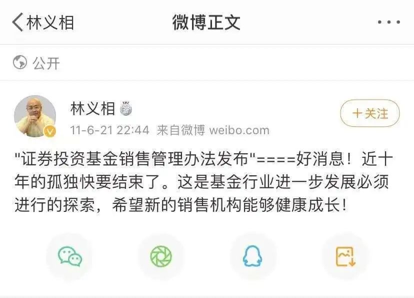 文件颁布后,天相投顾董事长林义相激动地发了一条微博:“好消息,近十年的孤独快要结束了,希望新的销售机构能够健康成长”。好买财富创始人杨文斌跟帖:“后十年结伴而行。”