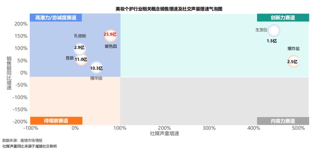 在美妆个护的各种增长概念中,玻色因的销售额规模最大,为25.9亿元;胜肽、乳糖酸等护肤成分销售额也都保持不错的增速,科学护肤认知的正带动美容护肤行业发展,且这3种功效成分均在市场表现出高忠诚度和较高发展潜力。