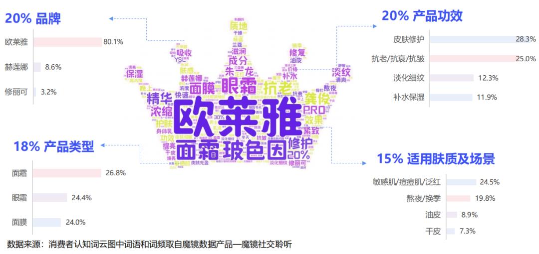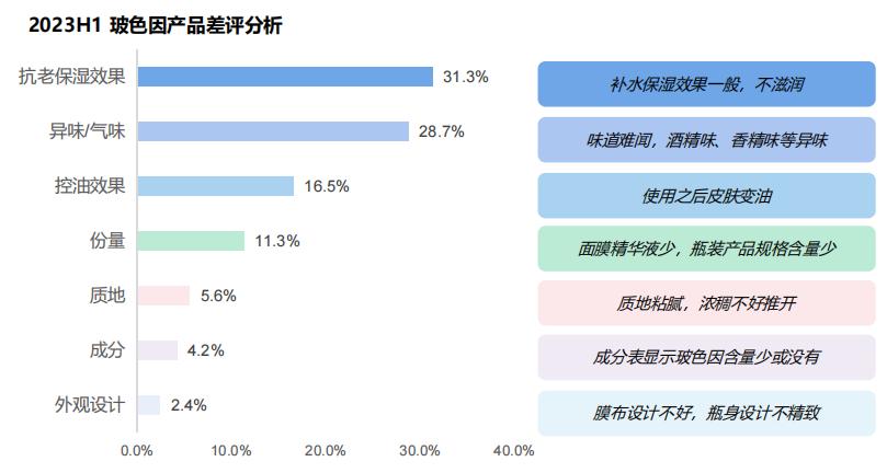 从负面评价维度来看,31.3%的声量反映消费者对于产品的抗皱、保湿效果不满,不如预期,部分品牌产品添加的玻色因含量极低,导致产品的效果不达消费者预期,存在过度宣传的情况。