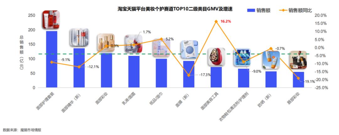 白皮书显示,2023年上半年,美妆个护类目整体表现欠佳,TOP10的大部分细分类目呈现下降的趋势,其中面部彩妆上升0.9%、乳液/面霜上升+1.7%、纸品/湿巾上升5.2%,以及面部美容工具上升+16.2%。从销售额规模来看,TOP10各个类目贡献GMV均在50亿元以上,排在前三名的是面部护理套装、面部精华和面部彩妆类目。