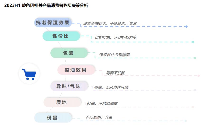 《白皮书》显示,根据玻色因相关产品的电商消费者反馈,消费者的购买决策主要受七个方面因素影响:抗老保湿效果、性价比、包装、控油效果、异味/气味、质地和分量。其中产品的抗老保湿效果是影响消费者购买的主要因素。抗老依旧成为消费者购买玻色因的首要决策因素。