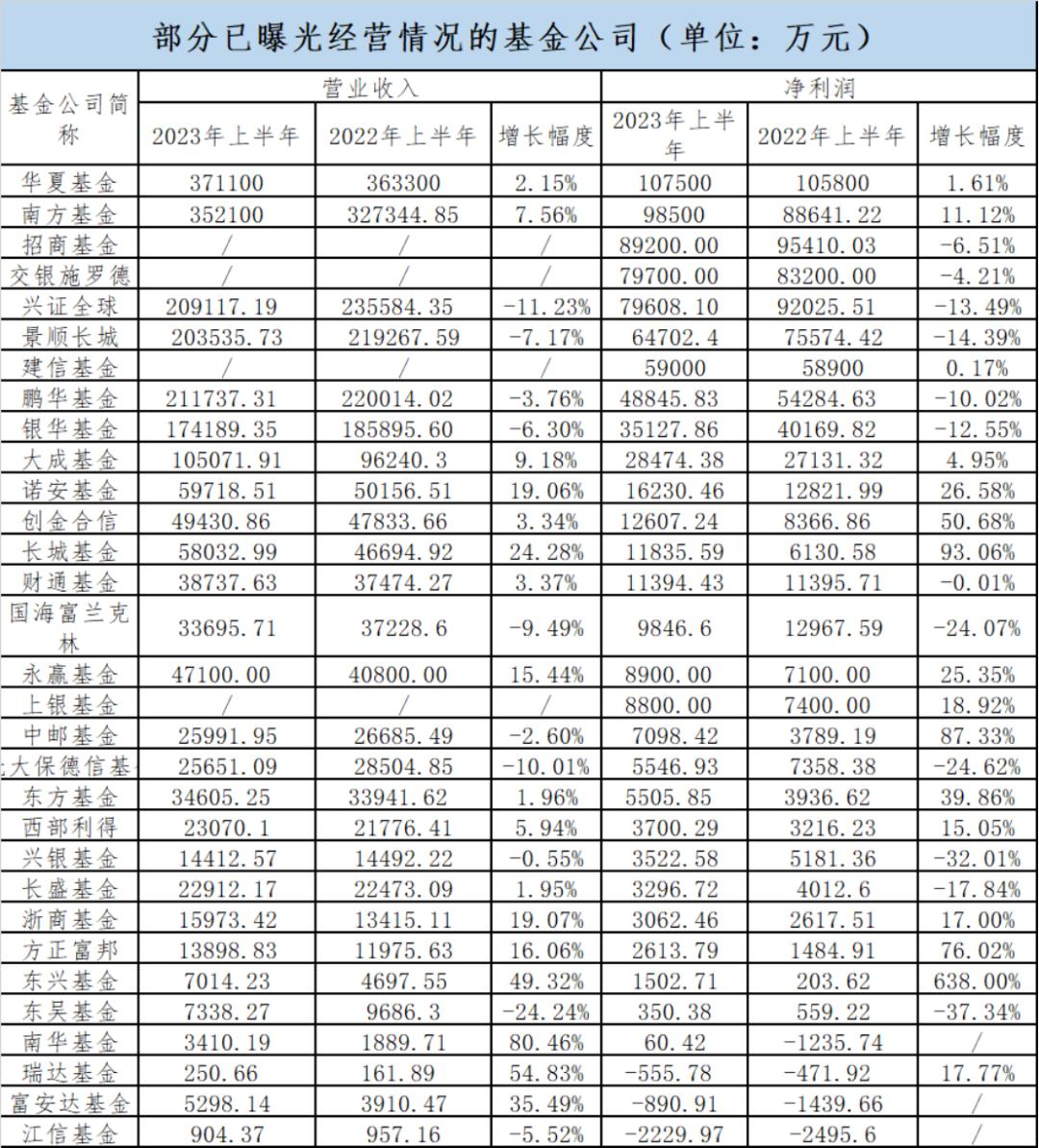 继华夏基金之后,随着上市公司2023年半年报逐渐披露,包括南方、兴证全球、景顺长城在内多家基金公司净利润陆续曝光。