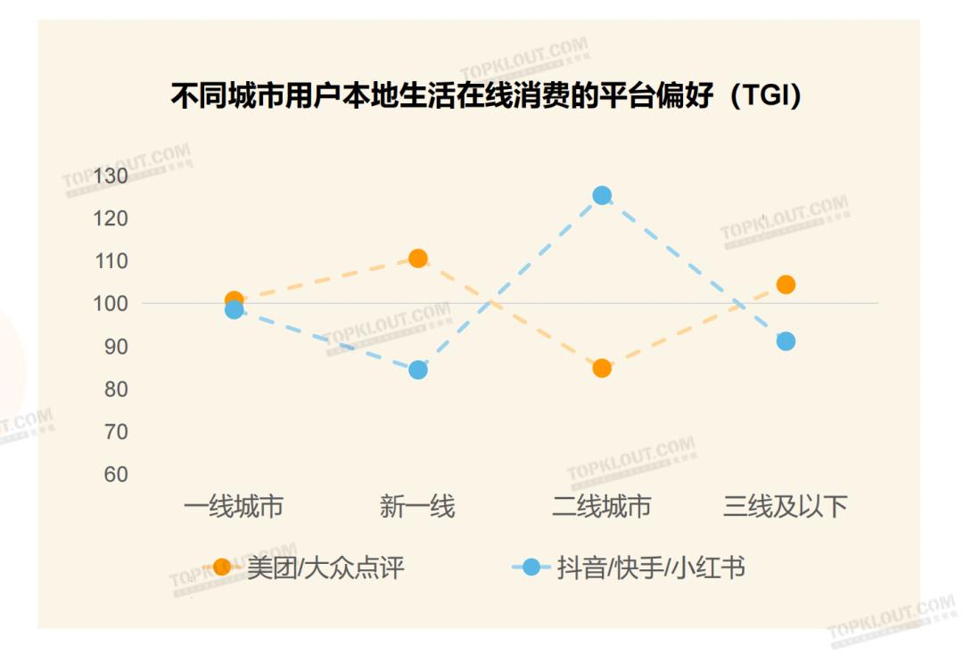 美团、大众点评等综合类平台在新一线城市用户中偏好度最高,广泛的城市及商家覆盖率是其优势。而二线城市用户对于内容平台的本地生活消费有更高的偏好度,但其城市覆盖不足、仍有价值洼地待挖掘。
